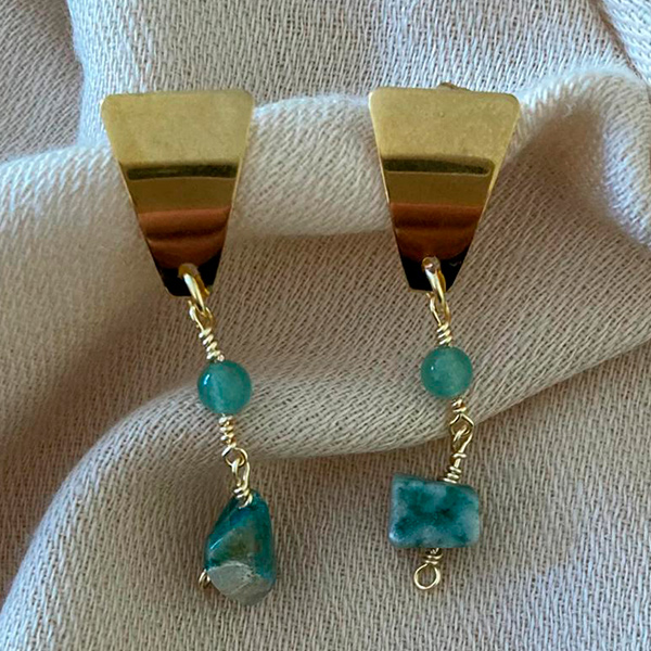 Lindos Aros de Aventurina Verde con Piedras Naturales Morganita cuadradas, engarzadas en enchape de oro y Pines enchapados en oro