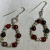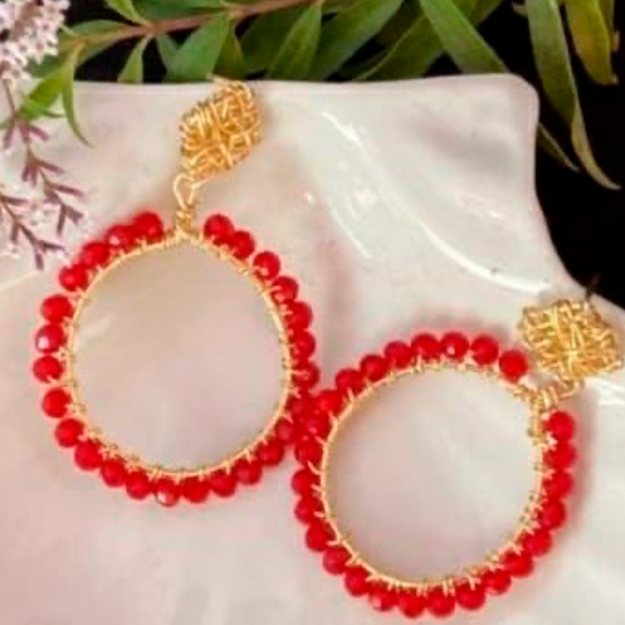 Llamativos Aros redondos con Cristales rojos, engarzadosen enchape de oro alrededor del Aro central. Con Pines cuadrados con entramado dorado.