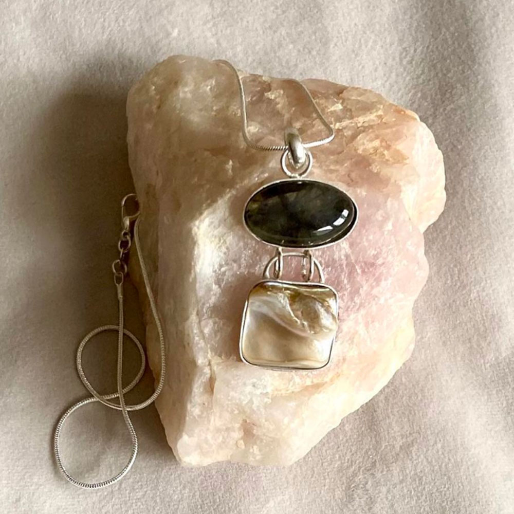 Colgante trenzado en enchape de Plata con piedra Turquesa craqueada y Cadena de Plata.