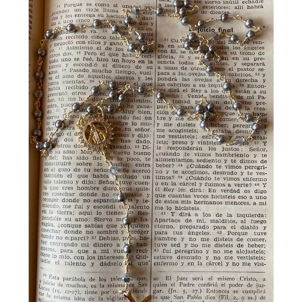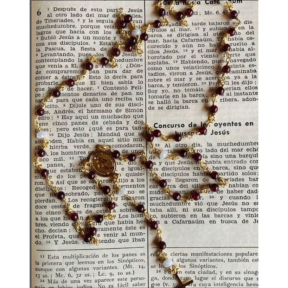 Rosario entrelazados con enchapa de Oro, Piedra Granate y Cristales blancos. Mitela y Cruz Gold. Mide 72 cms.